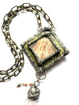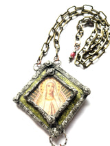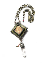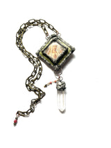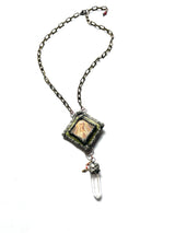 Connect to the Cosmic Axis, the umbilical cord that ties your earthly self to the heavens. Expect to be nourished by the Divine and trust that the link between you and the source cannot be severed. The Great Mother, the Queen of heaven is ensconced in pewter and shines from atop a precious Serpentine stone believed to stimulate the crown chakra and develop relationship with the spiritual realm. A rhodonite and pyrite embellishment dangle from a clear quartz point facilitating open pathways and clarity.