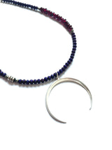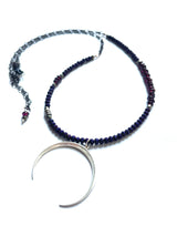 Goddess of Winter, ride your wolf and pound your hammer through the sky in the silvery light of the moon and reflection of the snow. Mother of many, protector of animals, master of the cold. Thunderous woman go where no other dares to go making preparations for new life to become abundant. Deep purple, faceted czech glass beads, pyrite and silver discs tell the story of piercing landscapes. Garnet preserves the memory of the warmth within and a return to the land of plenty. Divine lineage depend on your actions of strength. A silver plated moon calls you to howl in this truth.