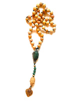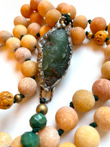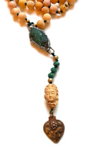 Sacred Mother, who Loves me unconditionally hear my prayers. Feel the gentle touch of the Mother washing over your heart like water upon river stones. This entirely hand knotted beauty displays yellow and peach hued river stone beads. A spectacular Green Aventurine center magnifies increase. Bring on the Love, abundance and prosperity! The image of the Divine holds the face of Kuan Yin, a most beloved and gentle Mama, resting above a floral pendant.