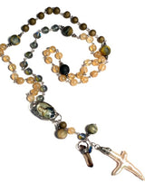 Our Lady of Immaculate Conception hold us in your arms. Mother and protector of the Highest Love we celebrate your saline womb, the sea of life, the ocean of all that is. The Holy Mother shines in a handmade pewter bezel with blue vintage glass cabochon on the reverse side. A smoky quartz point eliminates fear and freshwater pearl cross remind us of the depths of Her Love. Dazzling blue mermaid beads, gold druzy quartz and African turquoise beads speak to all that is and the Earth Herself.