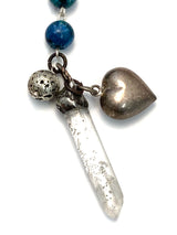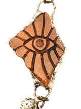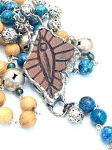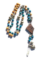 Hail Queen of the Cosmos! Turquoise howlite, silver, electro-coated, lava rock and warm toned wooden beads affix you to the stars. A Handmade clay ceramic centerpiece in a pewter bezel delivers an "All Seeing Eye", a symbol of protection from above. On the reverse side is imagery of the sacred feminine and the origins of where life begins. A vintage sterling sliver heart hangs beside a quartz point to gain clarity from the Universe concerning your desires.
