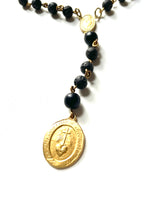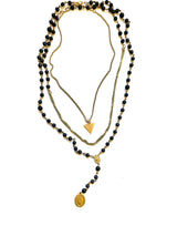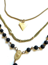 Hello Maiden. Sexy Mother. High up on your Throne, Crone. Matte gold plated chain, black lava and smooth onyx beads, YES! The inverted triangle plays on the elements of Water, Earth and of course, the Sacred Feminine. Three gorgeous layers that may be worn in combination or separately. With a Sacred Heart center and pendant you double the dose of radical Love.