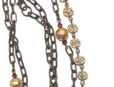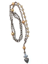 Connect yourself to sacred feminine knowledge with this creative take on the single chaplet rosary. This is one to wear every day as topaz crystal rondelle beads bring joy, abundance, good heath and generosity. Champagne freshwater pearls allow space for wisdom and protect the wearer/desciple of the Divine Feminine. Amethyst rondelle accent beads transmute negativity into Love. The antiqued, copper, oval chain add an aesthetic of strength. A rustic heart/cross pendant may be interpreted as a symbol of the feminine inverted.