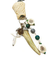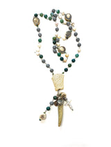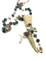 This rosary calls to the wild and thrashing shores of the Earth. To the untamed watery eden of the Mother's oceanic womb. Where there is riotous creative energy, there is also peace. Moss agate beads foster tranquility. Patinated lava rock beads and matte white magnesite beads amp up creative visualization while also harmonizing peace and passion within the heart. The coral (skeleton) centerpiece further generates inner serenity while increasing intuition and imagination. Antler beads and the antler point  magnify growth, expansion, strength and abundance. A freshwater pearl cross reminds us of our true direction. A sweet embellishment of Our Lady finishes this piece.