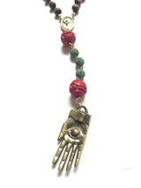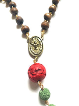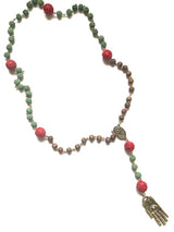 Enact your Divine Love from within by calling upon them: Ishatar! Innana! Aphrodite! This rosary with gold plated Hamsa contains green lava rock beads, wooden beads with spiral carvings and  beautifully carved cinnabar beads. A Holy Spirit/Holy Family gold plated centerpiece calls one to ascension. Rise up, Fatimah al- Zahra! May The Hand of Mary, The Eye of God(dess), protect you on your journey. This image is honored in many spiritual faiths and practices & so may it be in yours.