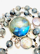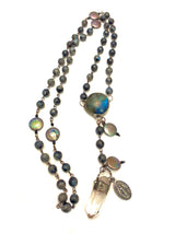 Queen of Heaven bestow the light of the stars upon your children. Feel Her strength, power and protection resonate from this labradorite centerpiece with pewter bezel. Faceted black labradorite beads on gunmetal chain. Irirdecent, flat disc, freshwater pearls with faceted black glass bead accents all reflect Her Light and Her Love. A small pewter heart charm and Immaculate medallion join harmoniously with a stunning pewter bezeled quartz point. handmade handcrafted necklace labradorite rosary witch jewelry crystal point Virgin Mary Madonna Goddess