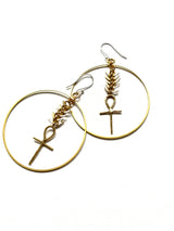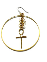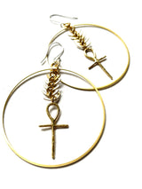 Ankh, Ankh!! Beep beep!! Attention Lovers of Life these earrings are the key. The ankh, "the key of life", an Egyptian hieroglyph and power object that symbolizes Life itself, drip from matte gold feathered chain. As they dance at the center of beguiling hoops, these lovelies seductively sway and are both clean and classic. They pair well with "Amunet" which can be viewed in the Necklaces collection.