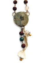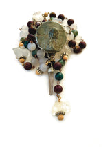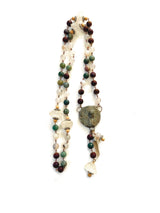 Whose your Mama? She is the Earth of course. Allow yourself to be wrapped in the arms of Mother Nature while praying this rosary. The restorative properties of rainbow jasper encourage a connection to the plants, the trees and all of Her creation. Her body, the body of the Earth strengthens your body, the whole of you, in a symbiotic relationship. Just as she heals you, she is healed. Montana agate draws upon positivity from the Universe and druzy amplifies Her unconditional Love. A porcelain Mother centerpiece draws you into Her bounty, while a smoky quartz point roots you to Her body and Her Spirit.