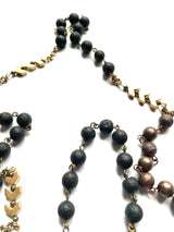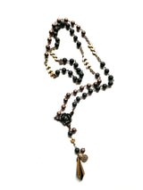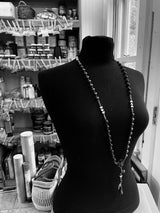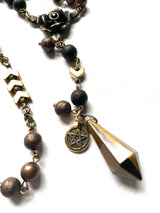 Ride the tiger brave and passionate one. You're seasoned and know how to do this sh*t! Matte gold chevron arrows with pyrite accents lead you round and round the circle of life. Stardust and antique copper beads and black lava chain lead the way for your path that is familiar but ever-changing. Consider yourself super-blessed, protected and ready for anything. Antiqued rustic rose center and swinging Tiger's Eye pendulum give you the answers on your quest as you tread the earth and follow the sun. A charming pentagram dangle as your compass...pay attention to the directions, the seasons and the stars but know that you are always home.