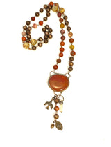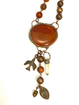 Ignite the Sacred Flame! Spark embers of creativity in communion with this large carnelian centerpiece. May energy abound and negativity disperse as this sacred stone radiates empowerment, motivation and courage, from its handmade pewter bezel. Agate and metal beads ground us to the Earth. A smoky quartz point, rustic patinated pewter Celtic cross/dove charm and small dove pendant call upon the blaze of creative ascension. The small bronze skull reminds us that creativity is a cycle that when dormant beneath the surface once again rises from below.