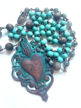 What does it mean to be As Bold As Love? It means being able to recognize the Divine within yourself. Truly loving yourself is an act of prayer. It's whispering kind and gentle words of encouragement, beauty and strength directly to your heart. Turquoise howlite beads prepare you to receive Higher energies that sooth the soul and give you a Motherly hug. Amazonite connects you to your heart and throat chakra to help you speak the truth through the Boldness of your Love.