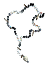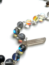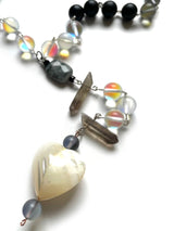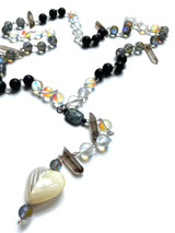 Be seen and shine. Your light is a reflection of Her body and the rainbow prism of Her Love. Blue and white mermaid beads illuminate your heart's desires from the deepest places within. Quiet and determined onyx beads promote confidence and assist in feeling comfortable in your soul-skin. Smoky quartz crystals ground your energy and heal old wounds. The faceted, black labradorite centerpiece sustains spiritual balance. A pearlescent shell and heart adornment finish this piece divinely.